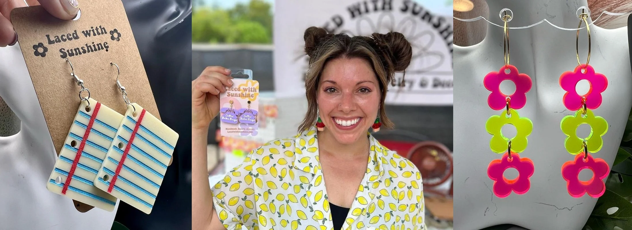 Creating items for Laced with Sunshine is all about bringing joy and whimsy to others. I make a large array of designs for earrings, cups, and other accessories, but daisies and locally inspired designs are what I'm known for.